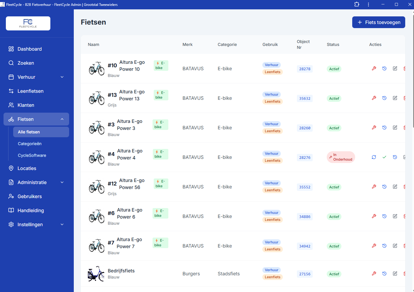 Alle verhuur- en leenfietsen overzichtelijk op één plek. Zie direct de status, het merk, CycleSoftware objectnummer en of een fiets in onderhoud is.